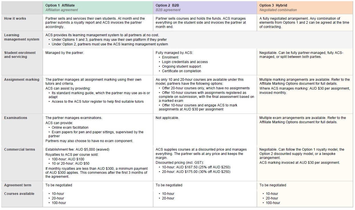 Having access to ACS' extensive library of digitalised education content has allowed us to scale our business quickly and efficiently. Their LMS is easy to access and manage, whilst also providing the consumer (student) with a professional and easy to use experience. John and Kate have always been a pleasure to work with and are quick to provide support when it is required."